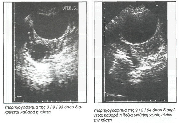 Η ασθενής που προσήλθε, 27 ετών, εμφάνισε μόρφωμα, κυρίως κυστικό, στη δεξιά ωοθήκη, διαστάσεων 4X4 χιλ. (Σύμφωνα με υπερηχογράφημα που διενεργήθη στις 3 / 9 / 93)