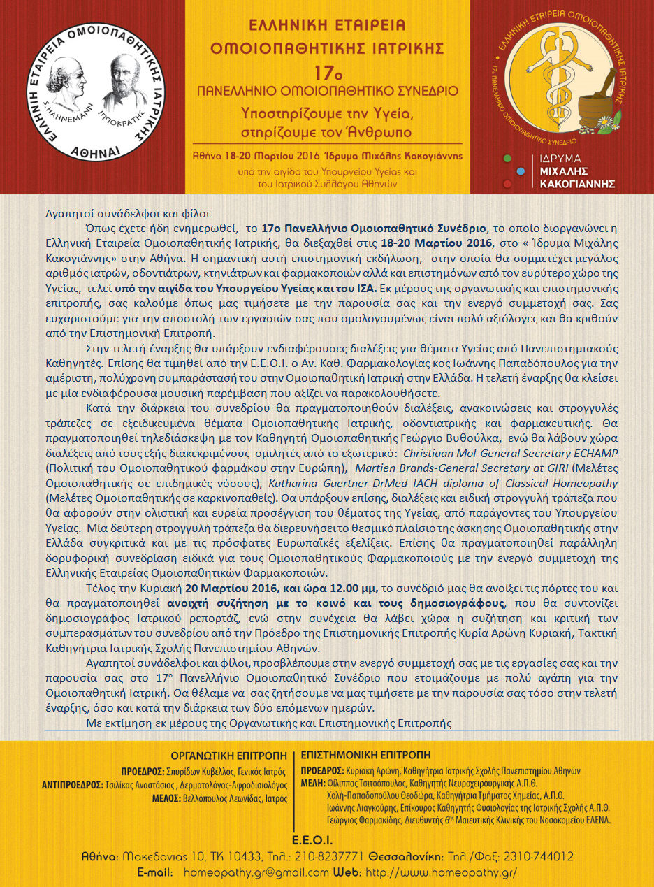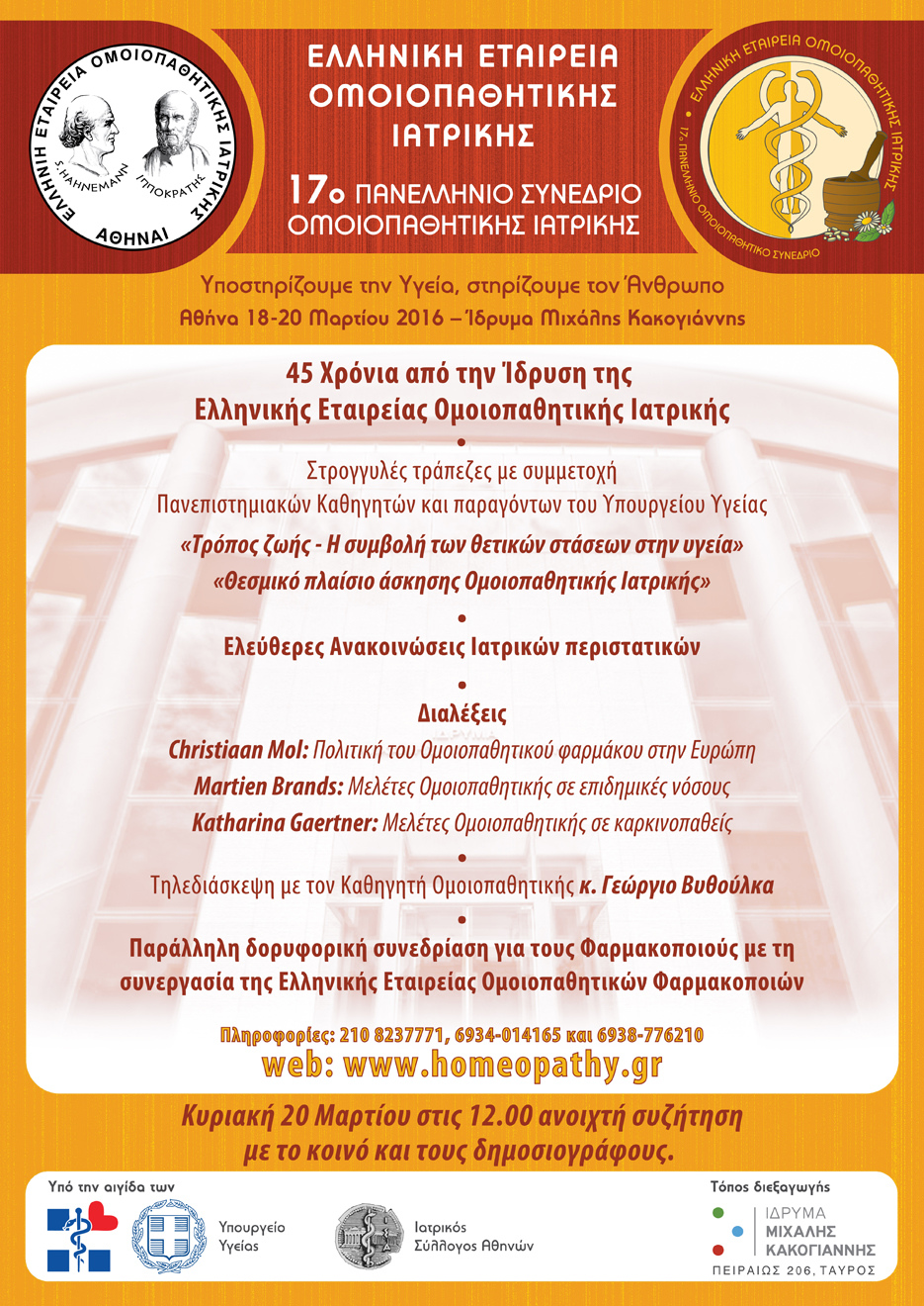 Όπως έχετε ήδη ενημερωθεί, το 17ο Πανελλήνιο Ομοιοπαθητικό Συνέδριο, το οποίο διοργανώνει η Ελληνική Εταιρεία Ομοιοπαθητικής Ιατρικής, θα διεξαχθεί στις 18-20 Μαρτίου 2016, στο « Ίδρυμα Μιχάλης Κακογιάννης» στην Αθήνα. Η σημαντική αυτή επιστημονική εκδήλωση, στην οποία θα συμμετέχει μεγάλος αριθμός ιατρών, οδοντιάτρων, κτηνιάτρων και φαρμακοποιών αλλά και επιστημόνων από τον ευρύτερο χώρο της Υγείας, τελεί υπό την αιγίδα του Υπουργείου Υγείας και του ΙΣΑ. Εκ μέρους της οργανωτικής και επιστημονικής επιτροπής, σας καλούμε όπως μας τιμήσετε με την παρουσία σας και την ενεργό συμμετοχή σας. Σας ευχαριστούμε για την αποστολή των εργασιών σας που ομολογουμένως είναι πολύ αξιόλογες και θα κριθούν από την Επιστημονική Επιτροπή.