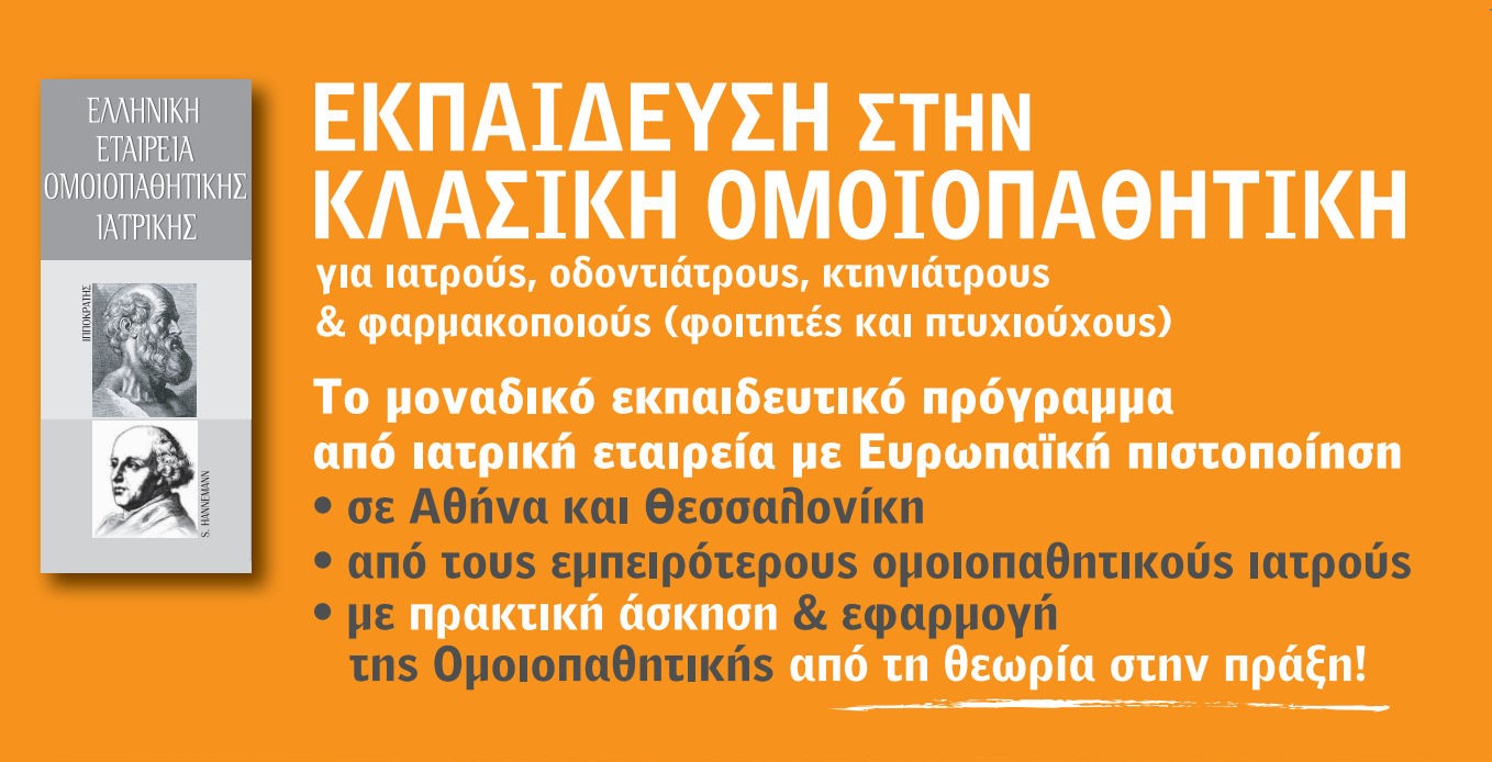 Η Ελληνική Εταιρεία Ομοιοπαθητικής Ιατρικής (Ε.Ε.Ο.Ι.) ιδρύθηκε το 1971 και είναι ο πρώτος και έγκυρος σύμφωνα με το νόμο φορέας των Ελλήνων Ομοιοπαθητικών Ιατρών. Η ΕΕΟΙ εκπαιδεύει έγκυρα γιατρούς, οδοντιάτρους και φαρμακοποιούς στην ομοιοπαθητική για περισσότερο από 2 δεκαετίες. Η ΕΕΟΙ είναι η μοναδική επιστημονική ιατρική εταιρεία που συμμετείχε στην εκπαίδευση του μεταπτυχιακού τίτλου σπουδών (Master) στην Κλασική Ομοιοπαθητική στο Πανεπιστήμιο Αιγαίου. Το τρέχον τριετές πρόγραμμα εκπαίδευσης της ΕΕΟΙ έχει την Ευρωπαϊκή πιστοποίηση της ECH και συμμετέχουν καθηγητές Ιατρικής & Φαρμακολογίας: