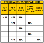 Ανάλογα με τα στοιχεία που ανευρίσκετε στο κάθε περιστατικό ξεχωριστά (Totality, Essence, Keynotes, Causative Factor, Essentials) γράφετε κάτω από την αντίστοιχη στήλη «ΝΑΙ» για να μπορεί να γίνει η στατιστική ανάλυση. Βάζετε «ΝΑΙ» σε όσα στοιχεία υπάρχουν. Αν ανευρίσκετε και τις 5 παραμέτρους στο περιστατικό, τότε θα βάλετε «ΝΑΙ» και στις 5 στήλες.