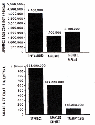 Θα ήθελα να σας δείξω μια διαφάνεια (ΕΘΝΙΚ. ΑΚΑΔ. ΕΠΙΣΤΗΜΩΝ ΗΠΑ), η οποία καταδεικνύει την υποκριτική σχιζοφρένεια που διακατέχει τις ιεραρχήσεις στον τομέα της Υγείας. Επάνω είναι ο αριθμός ετών που χάθηκαν από το τραύμα, τον καρκίνο και τις καρδιαγγειακές παθήσεις. Από κάτω τα ποσά που επενδύθηκαν στους τρείς αυτούς τομείς και βλέπουμε ότι είναι αντιστρόφως ανάλογα. Πού οφείλεται αυτό; Οφείλεται κυρίως στο γεγονός ότι το τραύμα είναι ακριβό στην αντιμετώπιση του, αφορά κυρίως νέους χωρίς ανάλογη οικονομική και κοινωνική ευρωστία και δεν αποφέρει άμεσα οικονομικά οφέλη. Στην πατρίδα μας δεν υπάρχει ούτε κρατική επιτροπή για την μελέτη, πρόληψη και αντιμετώπιση του τραύματος είτε κυκλοφοριακών, είτε εργατικού.