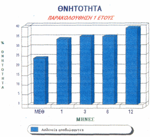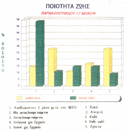 Στην μονάδα που εργάζομαι προσπαθήσαμε να αναλύσουμε την άμεση και απώτερη θνητότητα των ασθενών μας. Το ποσοστό των θανάτων μέσα στη μονάδα ήταν 24.8%, μέσα δηλαδή στα διεθνή ποσοστά. Δώδεκα μήνες αργότερα η θνησιμότητα αυτή φτάνει το 40%. (Διαφάνεια II). Στην συνέχεια με διάφορους αποδεκτούς δείκτες συνεκτιμήσαμε αυτό που λέγεται ποιότητα ζωής. (Διαφάνεια ΙΙΙ)