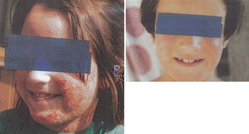 Θεραπευτικά σε μεμονωμένη περίπτωση ιλαράς παρουσιάζουμε δυο φωτογραφίες κοριτσιού που σπούδαζε στη Θεσσαλονίκη. Η τυπωμένη από τη φωτογραφική μηχανή ημερομηνία δείχνει την αποκατάσταση της ασθενούς σε λιγότερο από 24 ώρες.